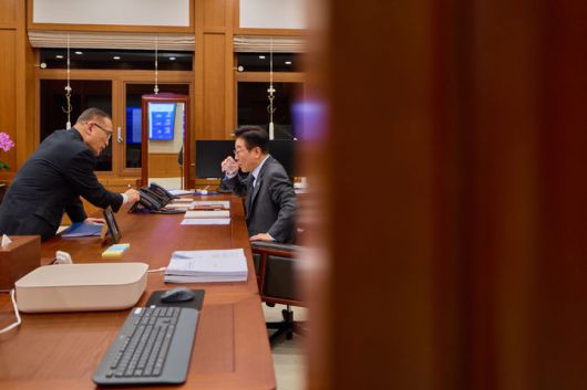 [서울=뉴시스] 청와대는 20일 이재명 대통령이 여민관 집무실에서 위성락 국가안보실장과 대화중인 모습을 SNS에 공개했다. (사진=이재명 대통령 SNS) 2026.01.20. photo@newsis.com *재판매 및 DB 금지
