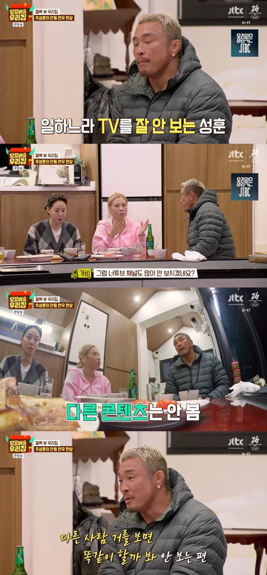 이어 가비가 "그럼 유튜브도 많이 안 보시냐"고 질문하자, 추성훈은 "저는 제 것만 체크한다. 다른 유튜브는 안 본다"며 "의미 없다고 생각한다. 다른 사람 걸 보면 똑같이 하려고 하게 되는데, 그건 재미없다"고 솔직하게 말했다.