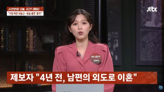 20일 방송된 ‘JTBC 사건반장’에서는 4년 전 남편과 이혼한 40대 제보자 A씨의 사연이 보도됐다. 보도에 따르면 A씨는 최근 한 연애 예능 프로그램을 시청하던 중 남편의 불륜 상대였던 여성 B씨가 출연자로 등장한 것을 보고 큰 충격을 받았다.