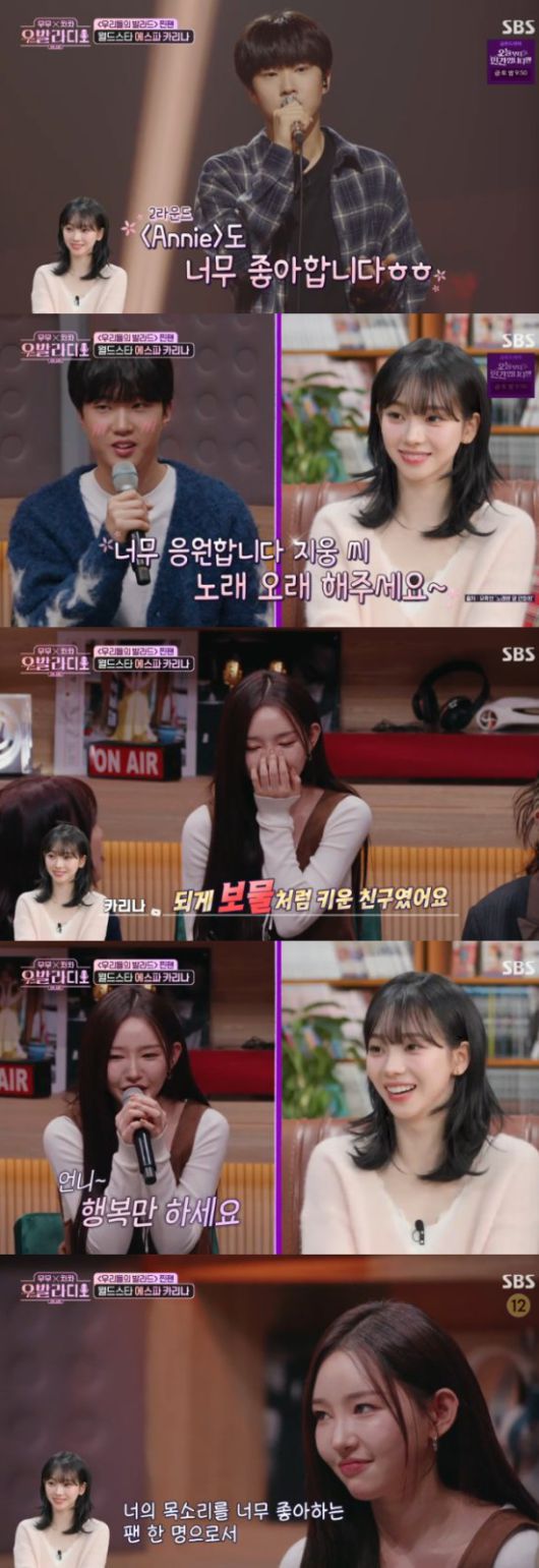 그리고 카리나는 김윤이도 응원했었다고 말했다. 카리나는 김윤이와 SM에서 연습생 생활을 1년 정도 함께 한 사이였다. 카리나는 김윤이와 찐친 모드를 뽐내면서 수화기 너머로 장난기 넘치는 모습을 보였다.