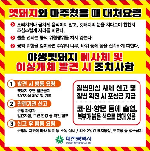 ▲대전 도심에 멧돼지 출몰이 잇따르자 대전시가 시민들에게 각별한 주의를 당부했다. 멧돼지 목격 시 대처요령 ⓒ대전시 |