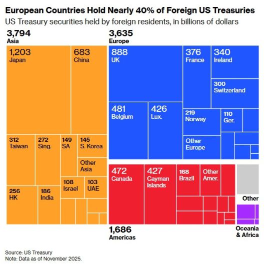블룸버그는 20일 유럽 금융회사와 정부가 보유 중인 10조 달러 상당의 미국 주식과 채권 등이 트럼프를 위협할 가능성을 제기했다. 전세계가 달러 자산을 선호하는 이유는 가장 신뢰할 만하고 안전하기 때문이다. 달러가 미국이 다른 나라에 압력을 가하는 무기처럼 쓰일 수 있고, 미국에 자산을 두는 게 안전하지 않게 된다면 상황은 달라진다. 금값 사상 최고치 폭등도 달러에 대한 높아진 의심이라는 해석이 일반적이다.