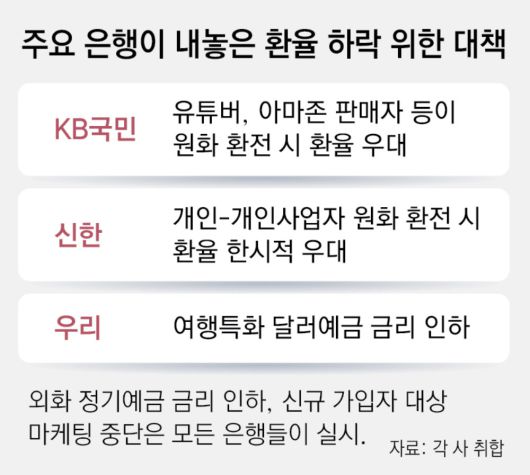 원-달러 환율을 안정시키기 위한 정부의 ‘달러 모으기 운동’에 은행권도 동참하고 나섰다. 달러화 등 외화를 원화로 환전하는 고객에게 환율 우대 혜택을 제공하고 수출 기업의 환전 인센티브도 논의하고 있다.