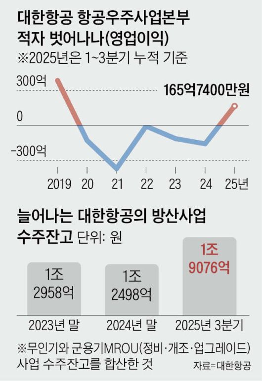 대한항공이 여객 중심의 사업 구조를 탈피해 방위산업을 새로운 성장 동력으로 키우고 있다. 만년 적자였던 항공우주사업본부가 지난해 흑자 전환이 확실시되면서, 방산이 실질적인 수익원으로 부상한 것이다. 대한항공은 유가와 환율 등 외풍(外風)에 취약한 여객업의 구조적 한계를 ‘방산 육성’으로 돌파하겠다는 전략이다.