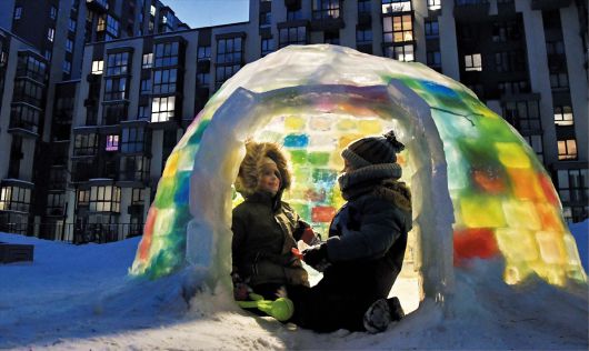 19일 우크라이나 르비우의 형형색색 얼음집(이글루) 안에서 어린이 두 명이 놀고 있다. 이글루는 영하 20도의 강추위가 닥치자 여러 가정에서 색소 탄 물을 얼려 함께 지은 것이다. 현지 매체는 “우크라이나 전역의 여러 주거 지역에 무지개빛 이글루가 등장하고 있다”면서 “러시아의 공격으로 전력과 난방 부족에 시달리는 우크라이나인들이 전쟁의 고통을 잊는 방법”이라고 소개했다.