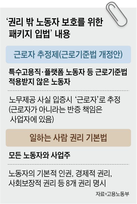 20일 고용노동부는 이런 내용이 담긴 ‘권리 밖 노동자 보호를 위한 패키지 입법’을 노동절(5월 1일) 이전 통과시키겠다고 발표했다. 핵심은 현행 근로기준법을 개정해 프리랜서·특수고용직·플랫폼 노동자도 원칙적으로 근로기준법상 근로자로 추정한다는 것이다. 또 이와 별도로 ‘일하는 사람 권리 기본법’을 제정해 근로기준법 적용을 받지 못하는 노동자의 기본권도 보장하기로 했다. 두 법안은 당정 협의를 거쳐 지난달 발의된 상태다.