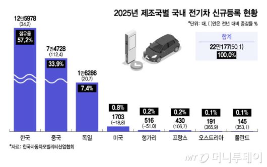 한국자동차모빌리티산업협회(KAMA)가 20일 발표한 '2025년 국내 전기차 시장 결산' 보고서에 따르면 지난해 국내 전기차 신규등록 대수는 전년 대비 50.1% 증가한 22만177대를 기록했다.