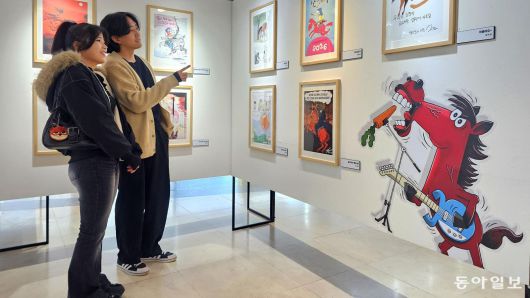 17일 경기 부천시 한국만화박물관을 찾은 관람객이 신년카툰전 ‘마이웨이’를 둘러보고 있다. 이 전시는 병오년 붉은 말의 해를 맞아 각자의 길을 스스로 힘 있게 달려가는 한 해가 되길 바라는 마음으로 기획됐다. 전시는 2월 28일까지 이어진다.