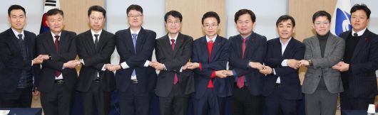20일 경북 안동시 경북도청에서 열린 대구·경북 행정통합 추진협의 회의에서 이철우 경북도지사(왼쪽에서 여섯 번째)와 김정기 대구시장 권한대행 행정부시장(왼쪽에서 다섯 번째) 등 참석자들이 통합 의지를 다지는 뜻으로 손을 맞잡고 있다. 경북도 제공 |