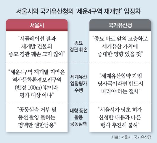 양측의 설전은 계속되고 있다. 국가유산청은 19일 언론간담회를 열고 고층 재개발이 종묘에 미칠 영향을 판단하는 세계유산영향평가(HIA)를 시행해 1년 안에 마무리하겠다고 밝혔다. 이에 대해 이민경 서울시 대변인은 20일 성명을 내고 “서울시가 제안한 애드벌룬을 활용한 현장 공동 실측에 대해 이번 주 안으로 공식 입장을 밝혀야 한다”며 “객관적 검증을 통해 경관 훼손 여부를 투명하게 규명해야 이후 국제기구 논의도 의미가 있다”고 주장했다.