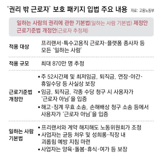 하지만 이 법이 시행되면 임금·퇴직금 청구 소송이나 부당해고 무효 소송 같은 민사 사건에서는 사업주가 ‘근로자 아님’을 입증해야 한다. 또 프리랜서 등은 연장·야간·휴일수당, 주휴수당과 연차휴가 등의 혜택을 받을 수 있게 된다.