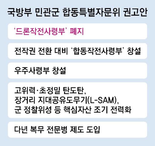 민관군 합동특별자문위원회 미래전략분과위원회(분과위)가 20일 발표한 권고안을 국방부가 수용할 경우 드론작전사령부는 창설 2년여 만에 해체 절차를 밟을 것으로 보인다. 권고안에는 전시작전통제권 전환에 대비해 ‘합동작전사령부’를 창설하는 방안도 담겼다. 현 정부 임기 내 전작권 전환을 위한 군 지휘구조 개편이 본격화될 것이라는 관측이 나온다.