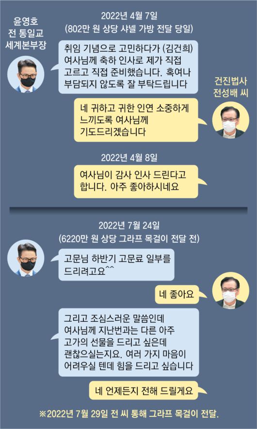 윤 전 본부장은 2022년 7월 24일 전 씨와 점심 약속을 잡으면서 “지난번과는 다른 아주 고가의 선물을 드리고 싶은데 괜찮으실는지”라며 운을 뗐다. 전 씨는 “언제든지 전해 드릴게요. 여사님 마음 여시면 화통하세요”라고 답했다. 윤 전 본부장은 5일 뒤 전 씨에게 6000만 원이 넘는 그라프 다이아몬드 목걸이를 건넸다. 이후 전 씨는 윤 전 본부장에게 “여사님이 큰 선물이라고 놀라셨지만 별다른 말씀은 없어요. 연락 주실 겁니다”라는 메시지를 보냈다.
