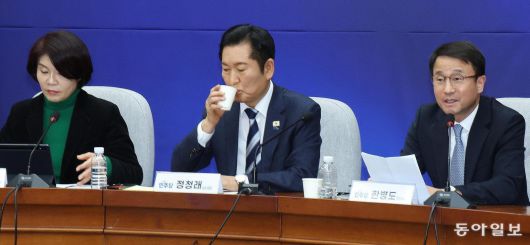 더불어민주당 정청래 대표(가운데)가 20일 서울 여의도 국회에서 열린 중대범죄수사청(중수청)·공소청법 정부 입법예고안 공청회에서 물을 마시고 있다. 이날 정 대표는 “오른쪽으로 많이 경도돼 있던 것을 중앙으로 맞추려면 왼쪽으로 힘을 줘야 되는 것”이라고 말했다. 왼쪽은 한정애 정책위의장, 오른쪽은 한병도 원내대표. 이훈구 기자 ufo@donga.com |