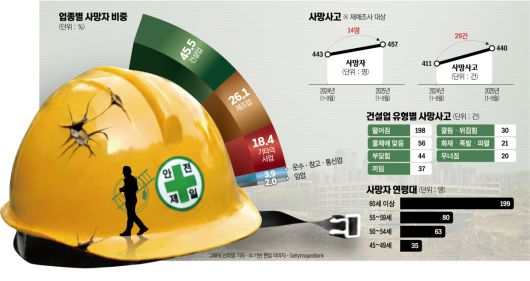 ‘재래식 사고’가 반복되는 점도 문제다. 같은 기간 떨어짐(추락) 사망자는 199명으로 전년보다 36명 늘었다. 부딪힘(45명)과 깔림·뒤집힘(30명)도 증가했다. 안전장치와 작업계획, 점검이 제대로 작동했다면 상당 부분은 줄일 수 있는 유형들이다. 같은 형태의 사고가 줄지 않는 것은 현장이 안전 수칙을 몰라서가 아니라 ‘안전이 작동하기 어려운 조건’이 고착돼 있기 때문이라는 해석이 나온다.