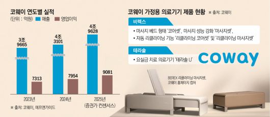 앞서 코웨이는 지난해 11월 마사지 베드 형태의 ‘코어셋’ 등 비렉스 의료기기 신제품 4종을 출시하며 가정용 의료기기 사업의 출발을 예고했다. 자사 슬립·힐링케어 브랜드인 비렉스의 포트폴리오를 의료기기 기능이 있는 제품으로 확대하며 경쟁력을 높였다.