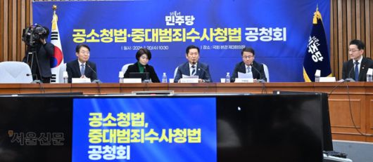 한편 이날 더불어민주당 정책 의원총회 형식으로 열린 공청회에서는 2시간 넘게 중수청의 이원화 구조 등을 놓고 전문가들의 열띤 토론이 벌어졌다. 검찰개혁추진단의 자문위원으로 활동했던 황문규 중부대 경찰행정학과 교수는 “(정부안이) 검찰개혁 취지를 몰각하고 있다”며 “과연 형사소송법이 보완수사권을 배제하는 방향으로 개정될지 의문”이라고 했다.