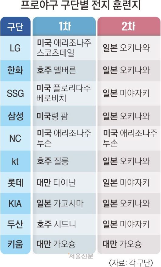 대안으로 주가가 올라가는 곳은 대만과 호주다. 키움 히어로즈와 롯데 자이언츠가 대만을 택했고 한화 이글스와 kt 위즈, 두산 베어스는 호주에 짐을 푼다. KIA 타이거즈는 일본 가고시마현 아마미오시마를 1차 전지훈련지로 낙점했다. 일본 프로야구 요코하마 DeNA 베이스타스 2군 선수단이 쓰던 곳인데 이곳으로 전지훈련을 떠나는 구단은 KIA가 최초다.
