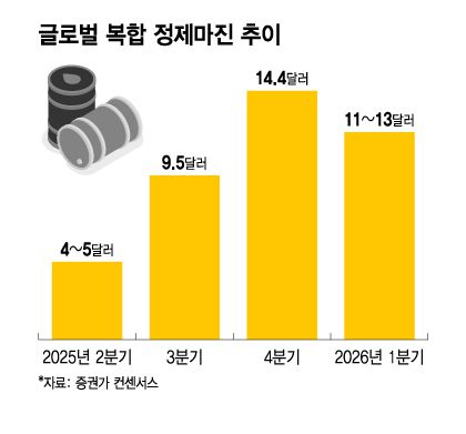 2026년 연간 전망은 사뭇 다르다. 전세계 경제 성장률 둔화에 따른 석유 수요 감소 우려가 지속되고 있고 고환율 기조까지 이어지면서 보수적인 시각이 우세하다. 미국의 관세 압박, 미·중 무역 갈등, 중동 지역 지정학적 리스크 등 복합적 요인으로 국제유가 하락 압력도 커지고 있다. 국제유가가 하락할 경우 원유 수입단가가 낮아지는 긍정적 효과가 있지만, 동시에 석유제품 가격도 하락해 정제마진이 축소될 수 있다.