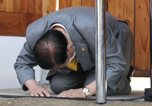 ▲2020년 3월 2일 경기 가평군 신천지 연수원에서 코로나19 집단 확산 사태를 사과하며 절하는 이만희 신천지 총회장. ⓒ공동취재단 |