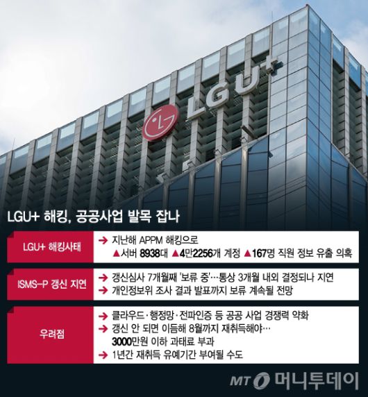LG유플러스의 공공사업 수주에 해킹 사태 여파가 영향을 줄 것이라는 우려가 나온다. 공공·금융·클라우드 사업 참여의 핵심 요건인 ISMS-P(정보보호 및 개인정보보호 관리체계 인증) 갱신이 장기간 지연되고 있어서다.