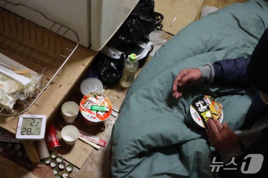 20일 찾은 서울 종로구 돈암동 쪽방촌에 위치한 박동명 씨(58)의 방. 온도계 숫자가 영상 2.2도를 표시하고 있다. 이날 오전 8시 기준 서울 기온은 영하 12도였다.2026.01.20/뉴스1 ⓒ News1 권준언 기자 |
