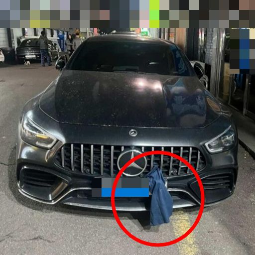 지난 19일 온라인 커뮤니티 보배드림에는 '번호판 가리려고 그릴에 옷 끼운 벤츠'라는 제목의 게시물이 올라왔다.