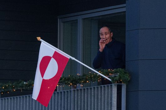 14일(현지시간) 그린란드의 수도 누크의 한 주민이 국기가 게양된 발코니에서 담배를 피우고 있다.[AP] |