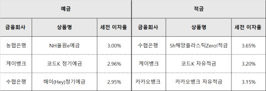 이날 기준 가장 높은 예금은 12개월 만기 기준 농협은행의 'NH올원e예금'으로 연 3.00%의 금리를 제공한다. 이어 케이뱅크의 코드K정기예금 금리는 연 2.96%, 수협은행의 헤이(Hey) 정기예금은 연 2.95%다.