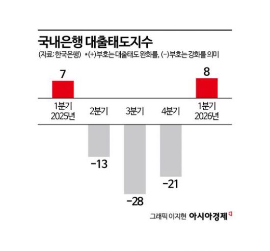실제 한국은행이 국내 18개 은행을 대상으로 대출행태 서베이를 조사한 결과 전 분기 대비 대출 기조를 완화하겠다는 은행이 더 많았던 것으로 나타났다. 이를 종합한 대출태도 종합지수는 '8'을 기록해 지난해 2분기 이후 4분기 만에 플러스 전환했다. 특히 가계 주택대출은 지난해 4분기 -44에서 올해 1분기 6으로 전환됐다. 지수가 플러스면 대출을 완화할 것이라는 응답한 금융기관 수가 '강화'보다 많다는 의미다.
