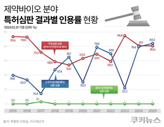 20일 쿠키뉴스가 백종헌 국민의힘 의원실을 통해 입수한 지식재산처 자료에 따르면 2015년부터 2025년까지 최근 10년간 제약바이오 분야 특허심판 결과, 존속기간 연장무효를 제외한 무효심판 심결과 소극적 권리범위확인심판 심결의 연 평균 인용률이 각각 56.47%, 81.97%에 달하는 것으로 나타났다.
