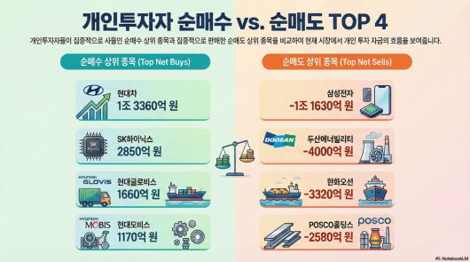 개인이 차익 실현으로 확보한 자금은 자동차와 모빌리티 밸류체인으로 이동했다. 이 기간 개인 순매수 상위에는 △현대차 1조3360억 원 △현대글로비스 1660억 원 △현대모비스 1170억 원 등이 포진했다. 주도주에서 수익을 확보한 뒤, 성장성과 실적 가시성이 부각된 종목으로 옮겨가는 전형적인 순환매 패턴이 나타난 셈이다.