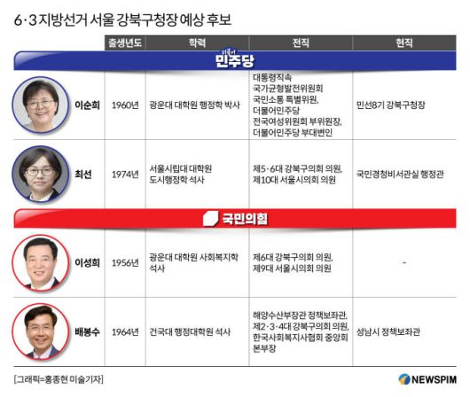 [서울=뉴스핌] 이경화 기자 = 6·3 지방선거를 앞두고 서울 강북구청장 선거 출마 예정자들의 발걸음이 빨라질 전망이다. 강북구는 더불어민주당 지지 성향이 매우 강하다. 역대 선거에서 수차례 보수 진영을 눌렀고, 이변을 바라는 보수 후보들은 큰 성과 없이 물러났다. 진보 색채가 짙은 강북구에서 현역 프리미엄까지 갖춘 이순희 강북구청장의 재선 도전이 유력하다.