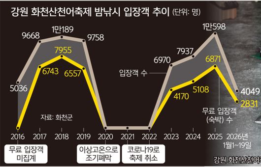 군은 2016년부터 밤낚시 프로그램을 운영하고 있다. 최문순 화천군수 아이디어다. 최 군수는 평소 아무리 많은 관광객이 화천을 찾아도 축제만 즐기고 떠난다면 지역경제에는 큰 도움이 되지 않는다고 생각했다. 그때 밤낚시를 떠올렸다고 했다. 어둠 속 감각이 민감해진 상태에서 오롯이 낚시에 집중할 수 있다는 장점에 더해 낮에 비해 산천어가 잘 잡힌다는 소문까지 나면서 밤낚시는 소위 말하는 ‘대박’을 쳤다. 매 주말에는 1000명이 넘는 강태공이 밤낚시를 즐긴다. 평일인 이날도 426명이 찾았다.