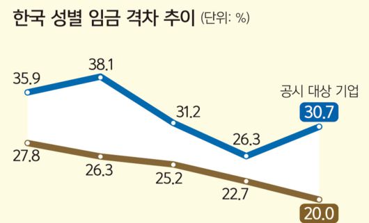 한국은 경제협력개발기구(OECD)에 가입한 1996년부터 지금까지 성별 임금 격차 1위 나라다. OECD 평균 남녀 임금 격차는 2024년 기준 11.0%인데 한국은 공시 기업 대상 기준 30.7%다. 여성이 남성의 연간 임금의 70%가량밖에 받지 못한다는 의미다.