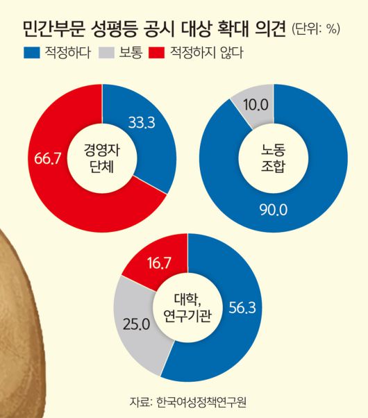 대상 기업 규모가 현재 미정이나 2021년 한국여성정책연구원의 ‘기업의 성평등 공시제도 도입방안 연구’는 500인 이상을 제안했다. 시행 초기에는 500인 이상 사업장을 대상으로 한 뒤 향후 50인 이상, 장기적으로 50인 미만 사업장까지 확대하는 안이 이상적이라는 분석이다.