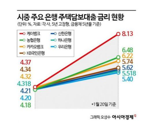 20일 금융권에 따르면 시중 5대 은행(KB·신한·하나·우리·NH농협)의 5년 고정형 주담대 금리는 4.20~6.48% 수준으로 집계됐다. 금리 하단이 4%대로 올라선 후 지속적으로 오름세를 나타냈다. 5년 전 약 2.50~4.00%와 비교하면 상·하단이 모두 2%포인트가량 높아진 셈이다. 일부 인터넷 은행의 경우 주담대 금리 상단이 7~8%에 달하는 경우도 확인됐다.