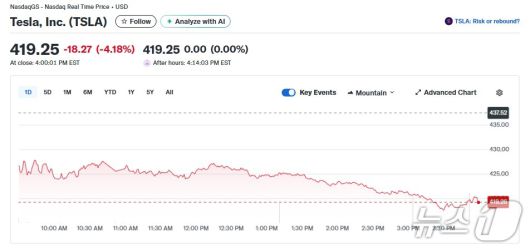 일단 테슬라는 4.18% 급락한 419.25달러로 장을 마감했다. 이로써 시총도 1조3940억달러로 줄었다.