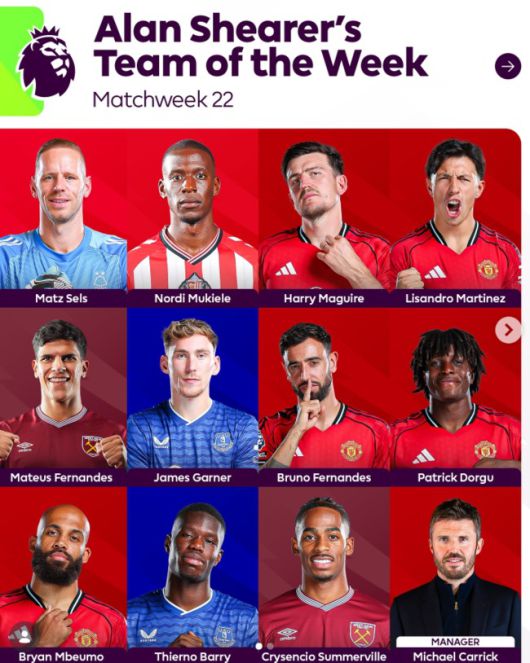 앨런 시어러도 마찬가지였다. 프리미어리그 이주의 팀을 선정하는데 캐릭 임시 감독과 더불어 맨유 선수만 5명을 넣었다. 선제골의 주인공 음뵈모와 이를 도우며 맹활약한 페르난데스, 무실점 수비를 완성한 매과이어, 마르티네스와 추가골 도르구를 포함했다. 11명 중에 절반에 가까운 5명이 맨유 선수로 구성됐다.