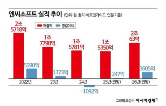 엔씨소프트는 그동안 실적 부침을 겪었다. 2022년 2조5718억원이었던 매출액은 2023년 1조7798억원, 2024년 1조5781억원까지 내려갔다. 증권가들이 전망한 작년 예상 매출액도 1조5359억원이다. 전년 대비 2.67% 감소다. 2021년 100만원이 넘었던 주가도 20만원대로 내려왔다.