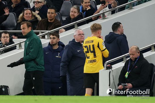 도르트문트가 대형 악재를 맞았다. 전반 25분 스벤손이 오도베르에 태클을 가했는데 스터드로 종아리를 가격했다. 주심은 VAR 판독 후 레드 카드를 꺼냈다.