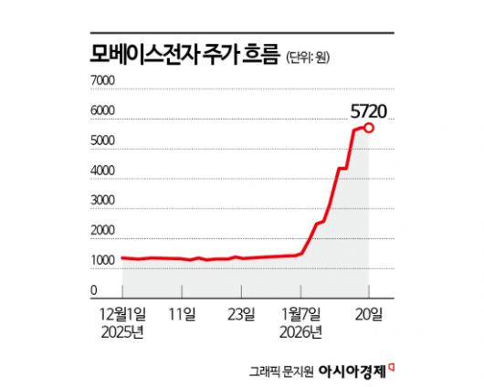 20일 금융투자업계에 따르면 모베이스전자는 올해 들어 310% 올랐다. 코스피·코스닥 시장 전체를 통틀어 가장 높은 상승 폭을 기록했다. 주가는 지난해 말 1395원에서 5720원까지 수직 상승했다. 시가총액은 4000억원을 돌파했다. 올해 들어 70억원어치 누적 순매수를 기록한 개인 투자자는 평가 수익률 63%를 달성했다.
