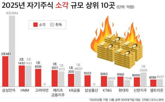 21일 기업데이터연구소 CEO스코어가 2025년 말 기준 시가총액 상위 500대 기업 중 신규 상장사를 제외한 479곳을 조사한 결과, 지난해 자사주 소각은 80개 기업이 20조9955억원어치를 집행했다.