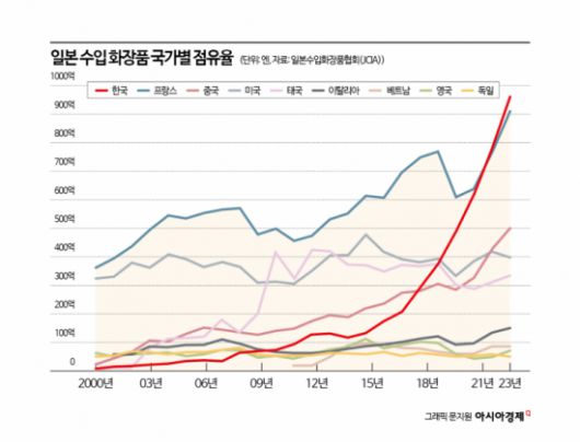 대한화장품산업연구원에 따르면 지난해 K뷰티의 일본 수출액은 10억8747만달러로 역대 최대 규모를 기록했다. 한국 화장품은 2022년부터 일본 시장에서 프랑스를 제치고 수입 화장품 1위에 올라섰다.