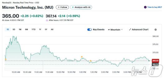 20일(현지 시각) 뉴욕증시에서 마이크론은 0.62% 상승한 365달러를 기록했다. 이로써 시총도 4108억달러로 늘었다.