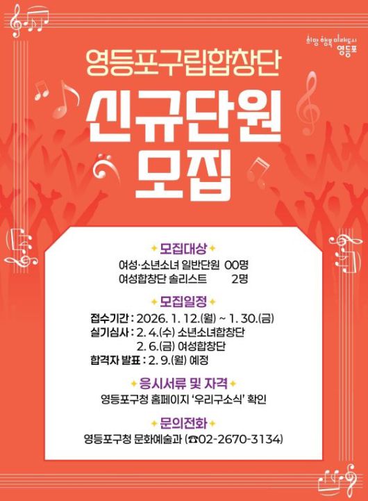 최호권 영등포구청장은 “음악은 구민과 마음을 나누는 소중한 연결고리”라며 “지역 문화예술의 저변을 넓히는 데 함께할 열정 있는 구민의 적극적인 참여를 기대한다”고 전했다.