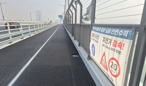 인천경제청은 또 교량 곳곳에 안전 수칙 안내 현수막 60개를 설치해 자전거 이용객들에게 제한속도 시속 20㎞를 준수하고 보행자가 보이면 일단 멈춰달라고 당부했다.
