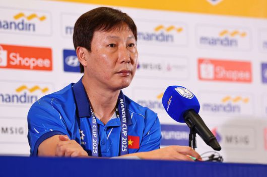 JAKARTA, INDONESIA - JULY 28: Head coach Kim Sang Sik of Vietnam U23 speaks to the media during the press conference of Vietnam U23 ahead of the Mandiri Cup final against Indonesia U23 at Gelora Bung Karno Stadium on July 28, 2025 in Jakarta, Indonesia. (Photo by Pakawich Damrongkiattisak/Getty Images)