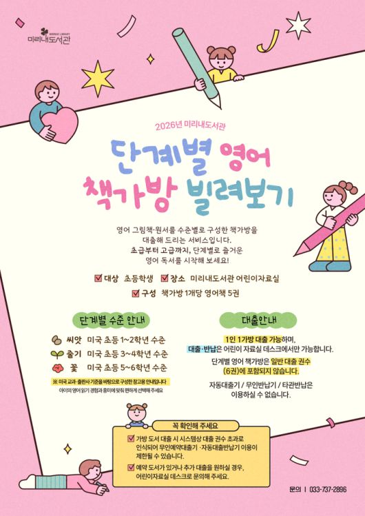 [스포츠서울ㅣ원주=김기원기자]원주시 미리내도서관은 관내 초등학생을 대상으로 ‘단계별 영어 책가방 빌려보기’ 서비스를 운영하고 있다.