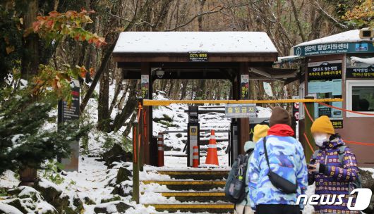 (제주=뉴스1) 홍수영 기자 = 21일 제주도 한라산에 대설특보가 내린 가운데 모든 탐방로가 통제됐다.